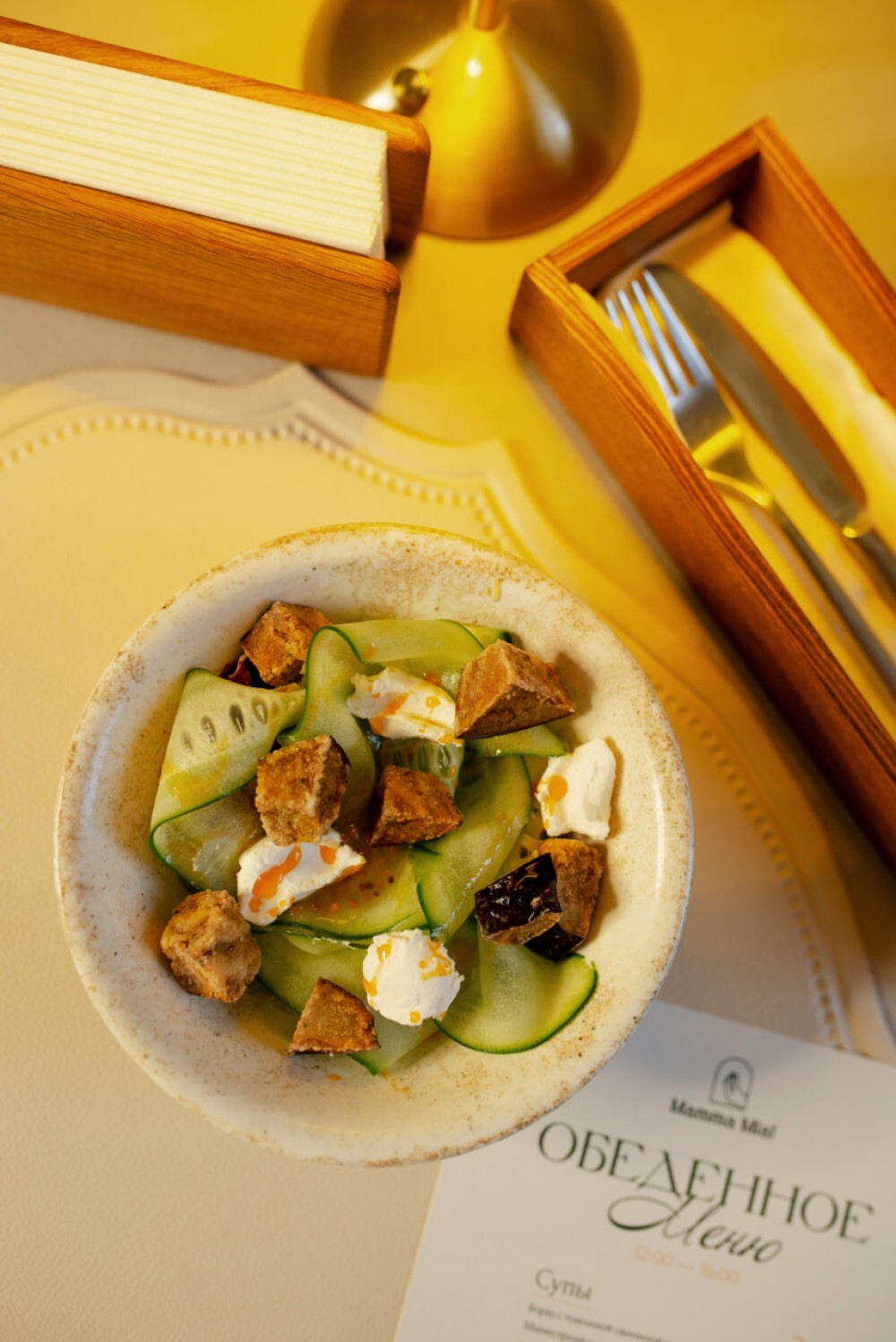 Зеленый салат с жареными баклажанами и сливочным сыром