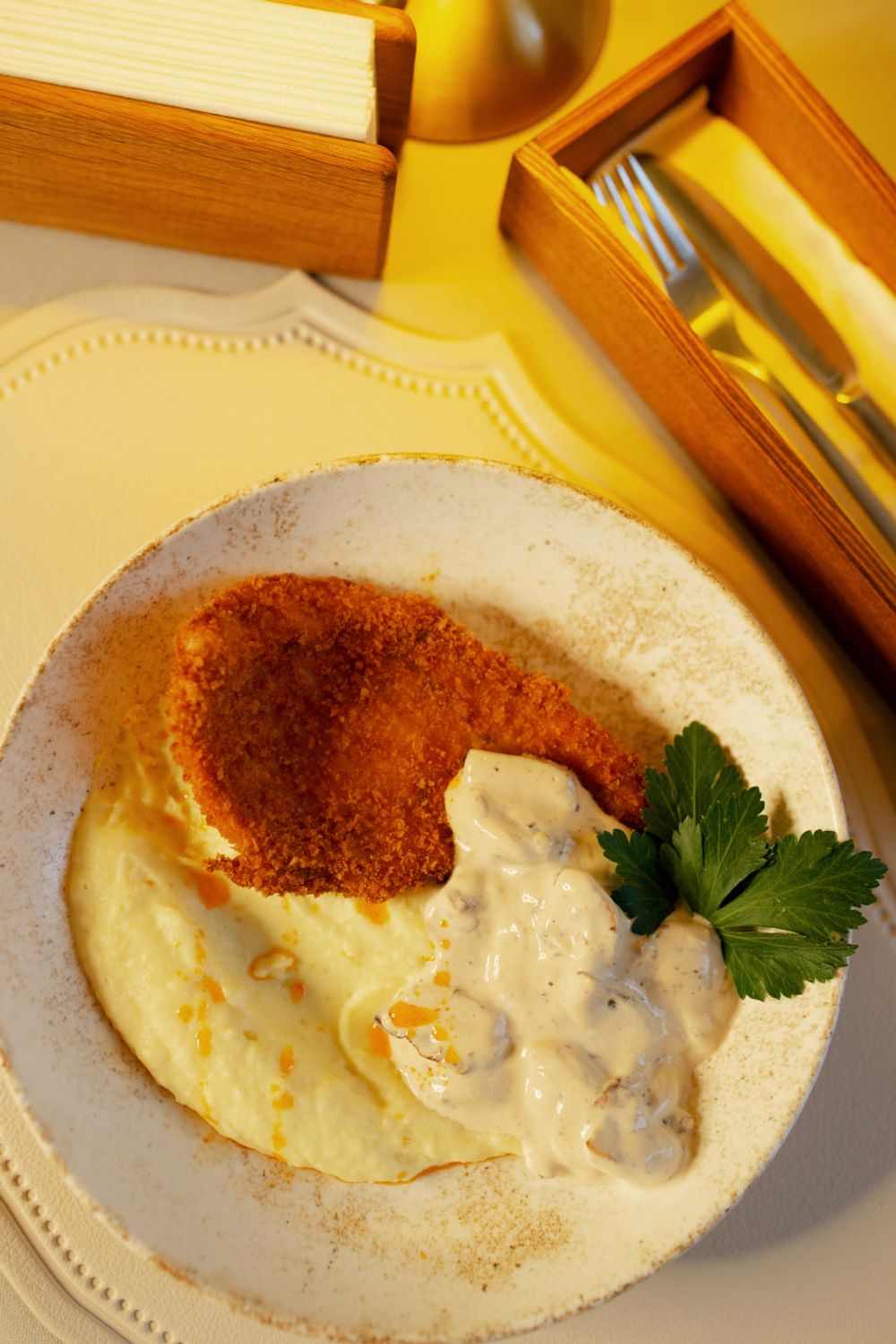 Куриный шницель с картофельным пюре и сливочно-грибным соусом
