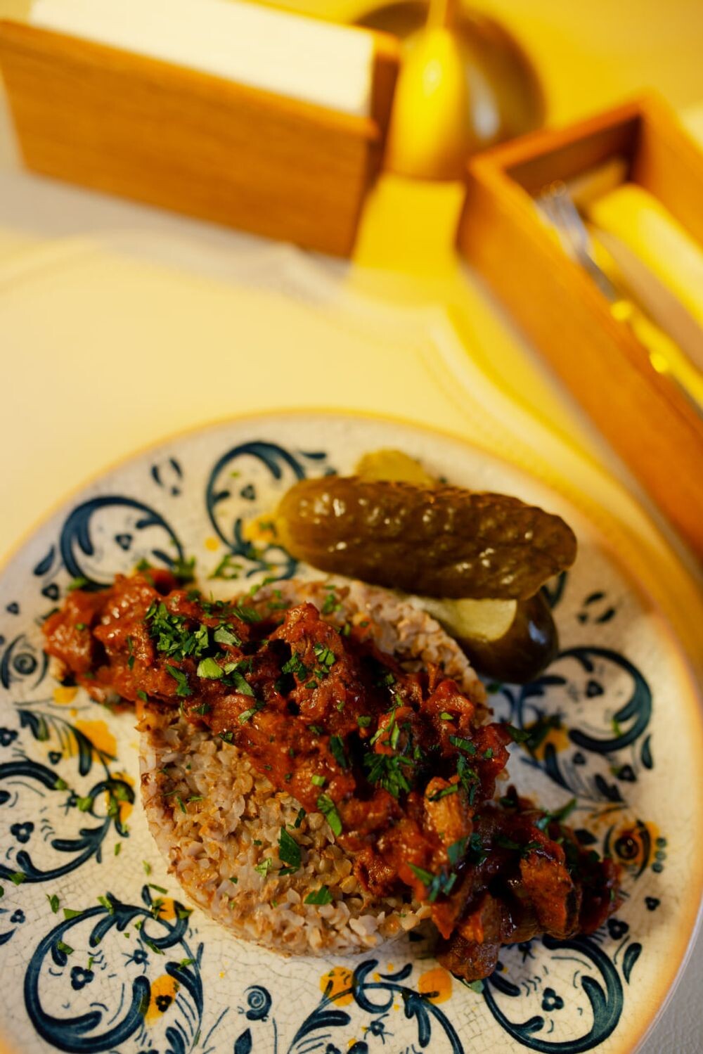 Гуляш из говядины с гречкой и бочковым огурчиком