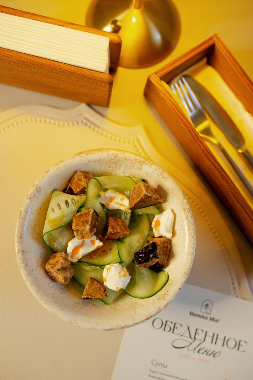 Зеленый салат с жареными баклажанами и сливочным сыром