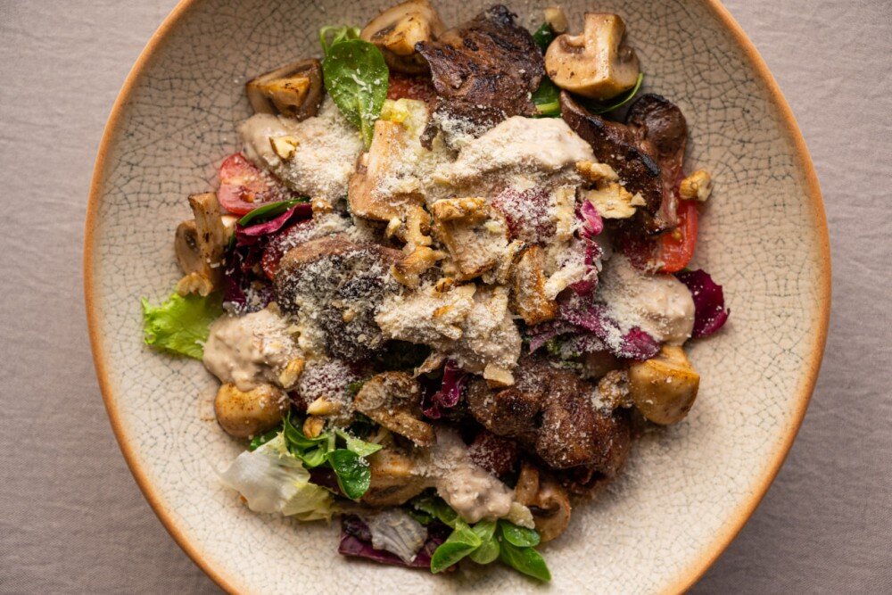Жареная печень цыпленка, томаты черри, жареные шампиньоны, сыр джугас, грецкие рехи, салат микс