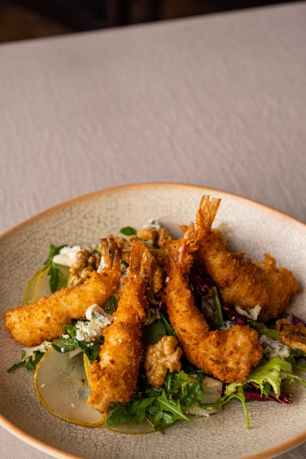 Креветка темпура, груша, сыр горгонзолла, грецкий орех, салат микс, руккола