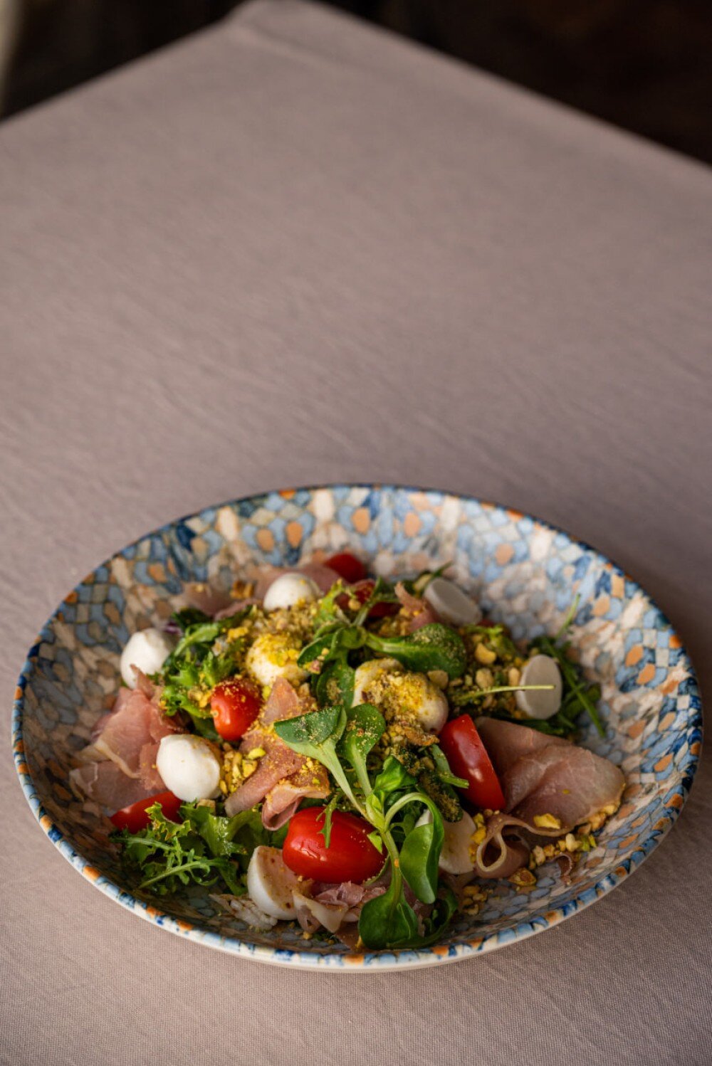 Салат с прошутто, моцареллой и фисташковой крошкой