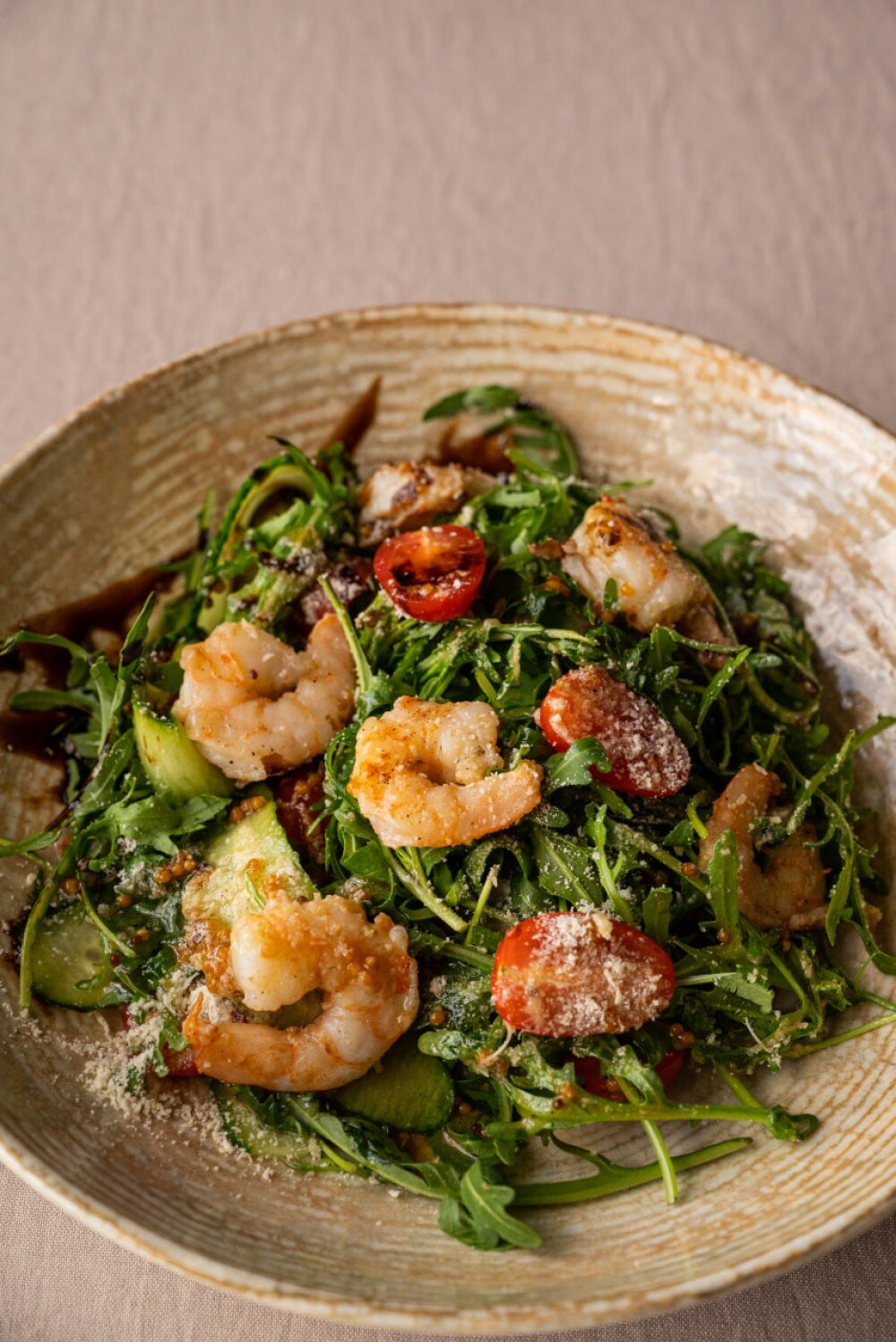 Жареные креветки, томаты черри, свежий огурец, сыр пармезан, руккола