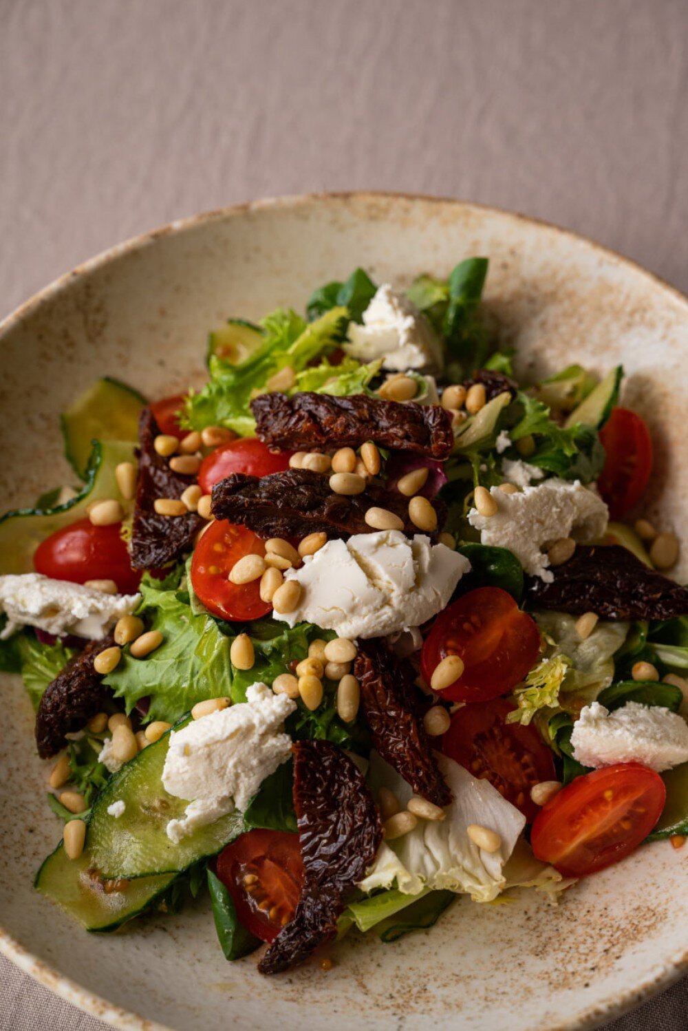 Вяленые томаты, сыр риккота, кедровые орехи, свежий огурец, томаты черри, салат микс